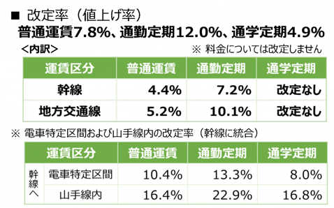 運賃区分別の平均改定率では普通運賃7.8%、通勤定期12.0%、通学定期4.9%となり、普通運賃、通勤定期が大きな値上げとなっています。